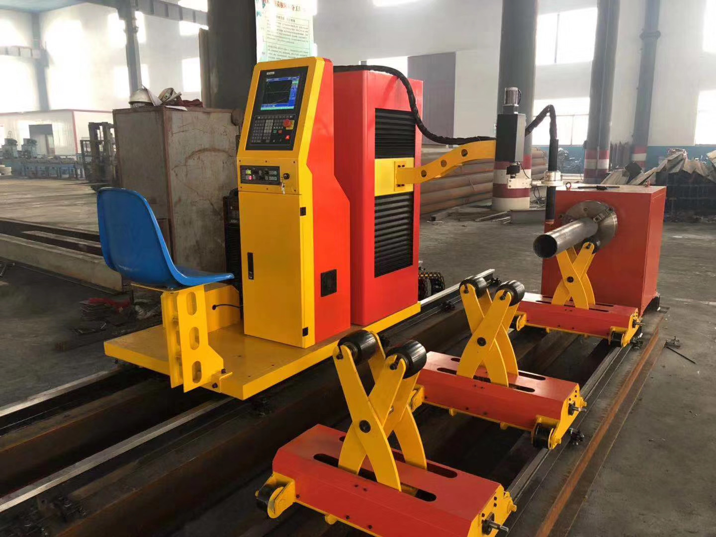 1、結構形式:軸(即管子轉動軸和沿管子的軸向移動軸)聯動,可切割各種相貫線形狀斷面,但不能切割任何坡口。